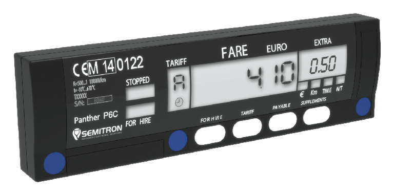 Relying upon the technological values of many years, SEMITRON's Research and Development team designed the taximeter Panther, which is equipped with an LCD display. It's a small size taximeter, which aims to meet all the needs of the professional driver, offering the usability of the Panther line and SEMITRON's unsurpassed reliability. Its basic advantages are the smart size, as well as its modern and distinct appearance.