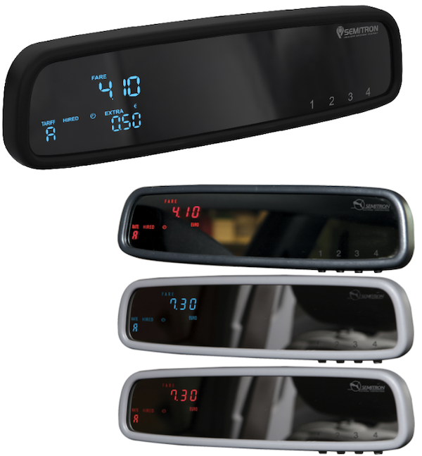 With a longstanding experience of 35 consecutive years in taximeter manufacturing, the department of Research and Development of SEMITRON designed and created a mirror taximeter that can be installed in any type of car, providing a new concept for the term "mirror taximeter". Technologically advanced with the use of high-end design and manufacturing methods, it covers every single need of a taxi driver. Its main advantages are its smart space-saving size, its usability, as well as its elegance.